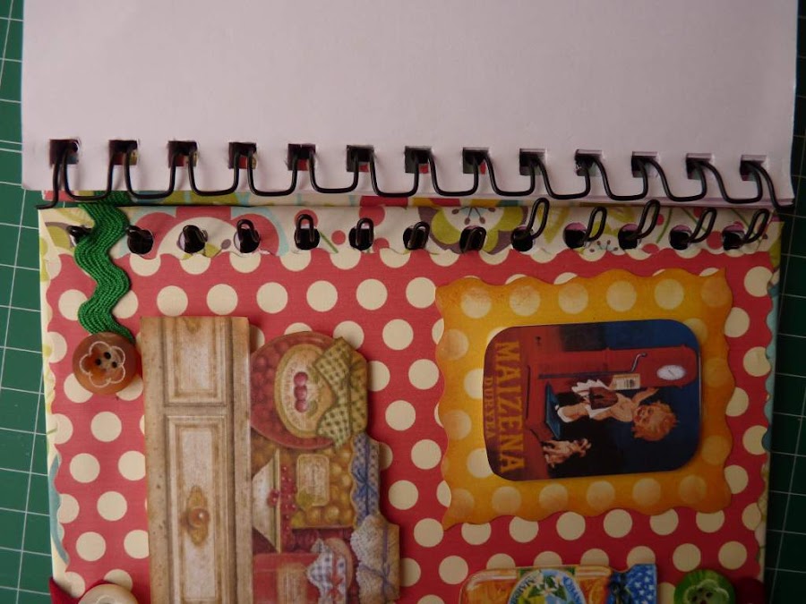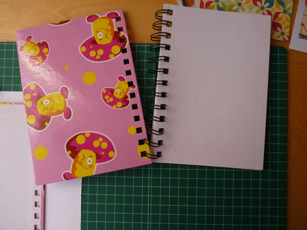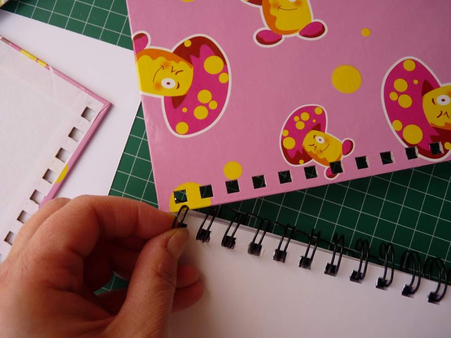 Arriba la portada y la contraportada con sus interiores. ¿Quién dijo que es difícil? Sólo hay que seguir estos pasos, y poner toda nuestra creatividad en el empeño. Es importante buscar libretas que tengan este tipo de espiral que veis, ya que es sencilla de retirar, y así se pueden forrar las tapas por separado y en su totalidad. Basta con abrir un poco cada una de las anillas, y saldrá con facilidad.