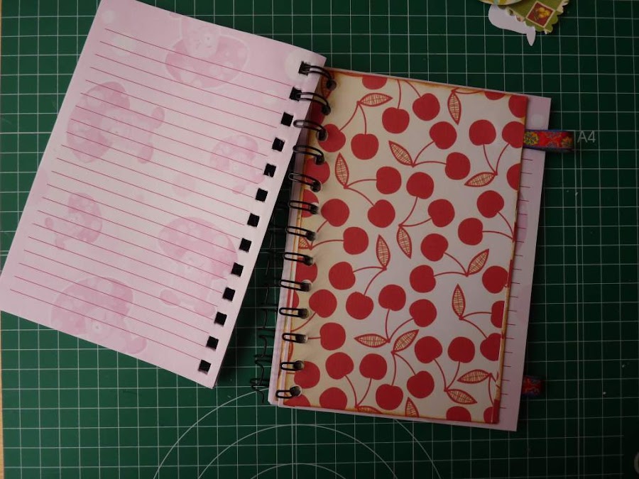 Ya tenemos la tapa forrada. Ahora colocaremos el papel interior. Pero antes, os voy a contar un truco: Si queréis colocar cintas, puntillas, etc. en las tapas, y no queréis que se vean los remates por dentro, debéis pegarlas antes que este último papel. Así, al ponerlo, tapará también los finales de las cintas. Ahora, es el momento de adornar las tapas al gusto de cada uno.Si queréis hacer separadores para el interior, cortáis cartulina o cartón finito, teniendo en cuenta que no debe sobresalir de las hojas de la libreta. Antes de pegar los papeles, colocaremos una cinta para mover en separador. Y hacemos los agujeros de la misma forma que en las tapas. Es el momento de volver a montar la libreta. Primero hay que poner los separadores. Sacamos de la espiral parte de las hojas, metemos el separador, metemos otra parte de las hojas, otro separador si lo hubiera, y terminamos de meter las hojas. Y hora las tapas: Aquí veis cómo es muy fácil separar las anillas, colocar la tapa y luego volver a unirlas haciendo un poco de presión en ellas. Me gustaría que os animéis a realizar este tipo de libretas. El resultado es espectacular, hemos "vestido" una simple libreta con un traje de fiesta. Espero que disfrutéis con ello tanto como yo, que he descubierto en el scrap una forma muy gratificante de pasar mi tiempo. Gracias por vuestra atención un día más, y recordad que el tiempo que se es feliz es el único que merece la pena ser vivido.