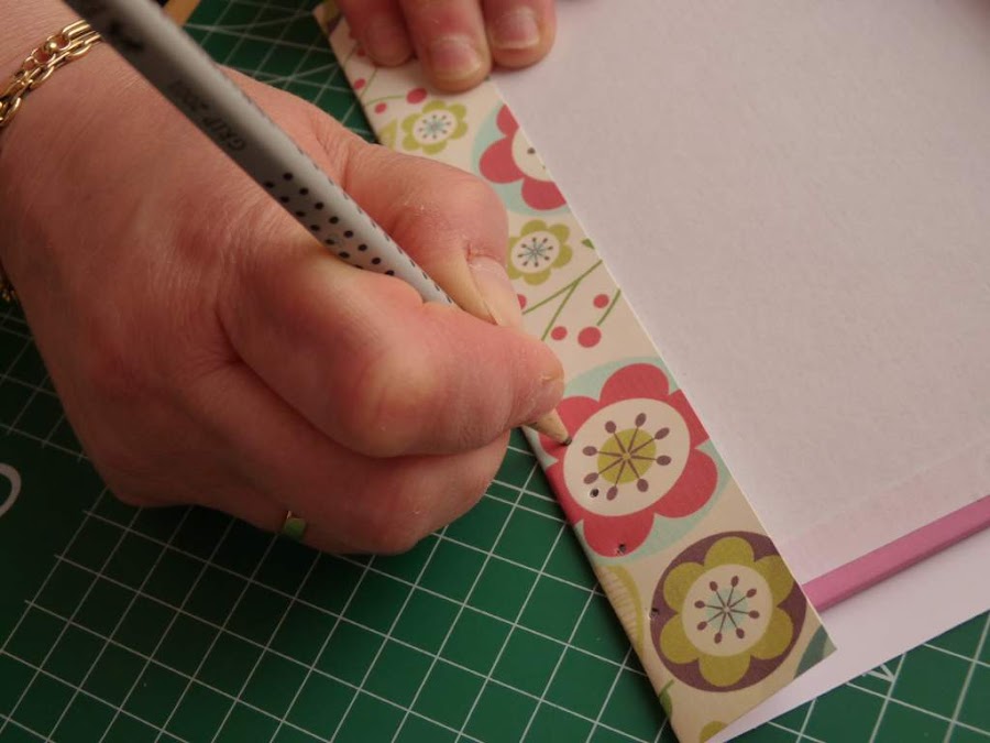 Ahora hay que hacer en el papel el agujero para las anillas. Si tenemos Crop a Dile, este paso lo realizaremos una vez pegado el papel. En el caso de no tenerla, colocamos la tapa sobre el papel todavía sin pegar, y buscamos con el dedo el lugar en el que están los agujeros. Con un lápiz afilado, marcamos los puntos perforando el papel. Esta herramienta comprada en un bazar por 0,90 euros nos sirve para hacer los agujeros.
