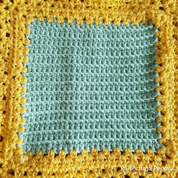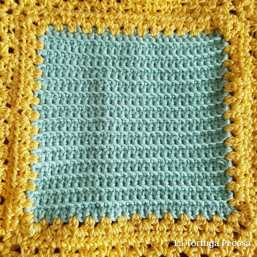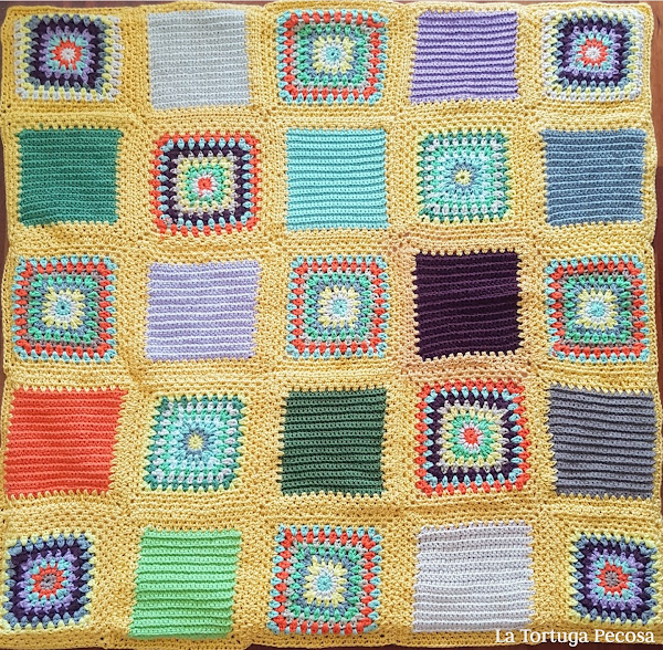Paso 3: Unir los cuadros haciendo el dibujo deseado. En mi caso perseguía un tablero de ajedrez (aproximación) y fui combinanco colores lisos (del paso 2 ) con colores mexclados (del paso 1-granny). La unión la hice con el hilo color amarillo para que no se vean las uniones.