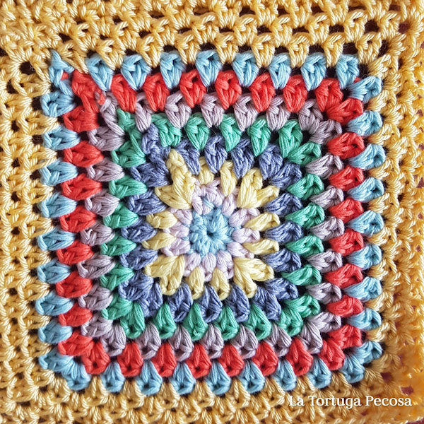 Paso 1- tejer cuadros de granny square de 8 filas de 8 colores diferentes, rematando el borde de 3 filas de color amarillo. Total de 13 cuadros de granny square.