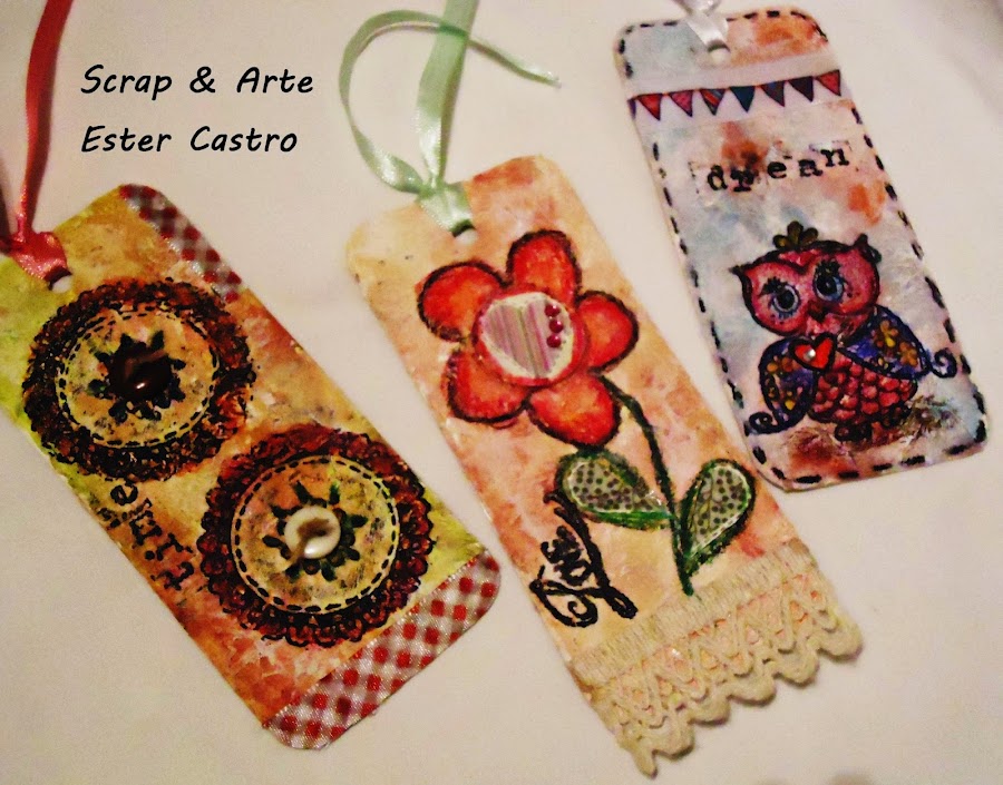 Yo sigo con mis trabajitos de scrap y en esta ocasión he realizado unos "Separadores o Puntos de Libros" en la Técnica de Mix Media y Reciclaje de cartón.