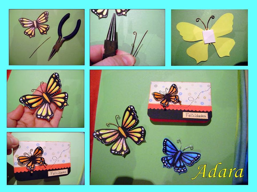 Una vez seco recortamos nuestra mariposa y con un trocito de alambre y unas tenazas creamos los cuernitos de la mariposa,se los pegamos por detras con cinta de doble cara 3d y voila ya esta lista nuestra mariposita para colocar en cualquier trabajo de scrap.