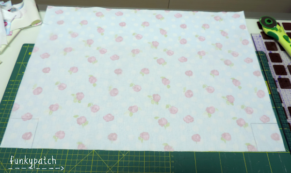 Marcamos en dos de las esquinas de nuestras telas por el lado mas largo (58 cm) un cuadrado de 6 cm. Esto nos sirve para hacer la base y los laterales del bolso que medirán así 12 cm.