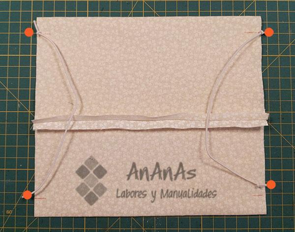 Hacer una marca a 1,5 cm de los bordes superior e inferior en ambos lados, esas marcas nos indican el lugar donde colocaremos los extremos del cordón para coserlos: