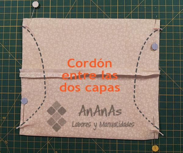 Colocar cada uno de los fragmentos de cordón en cada lado, haciendo que cada nudo quede a la altura de las marcas que acabamos de hacer (foto 1), colocarlos entre las dos capas de tela (foto 2):