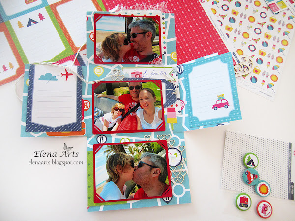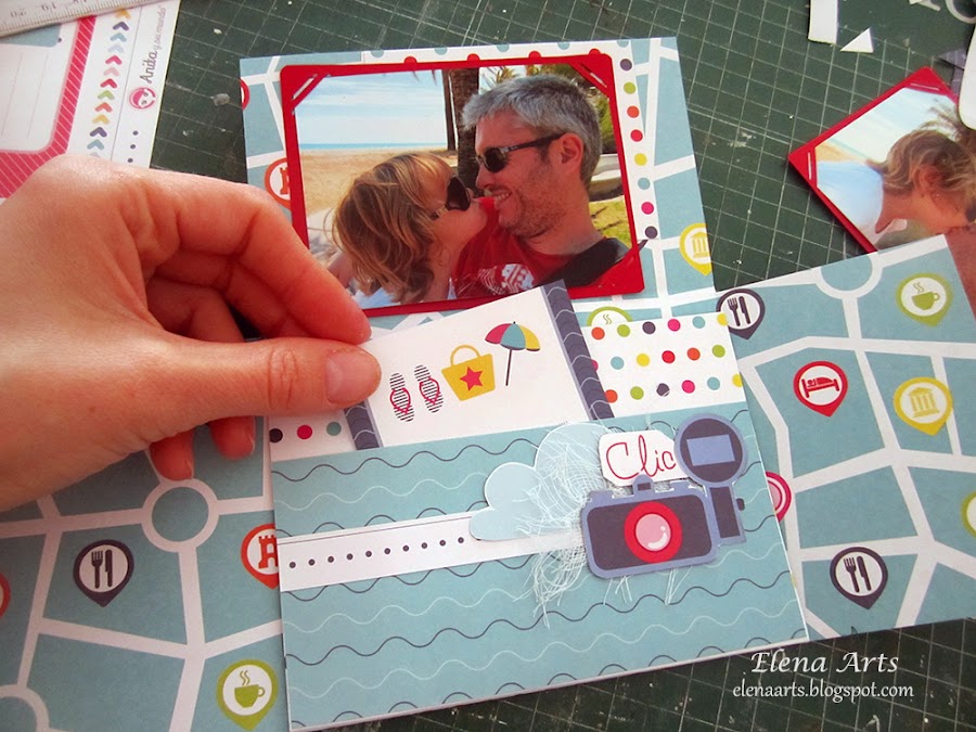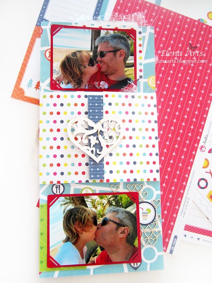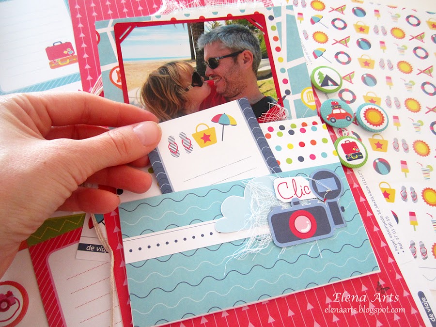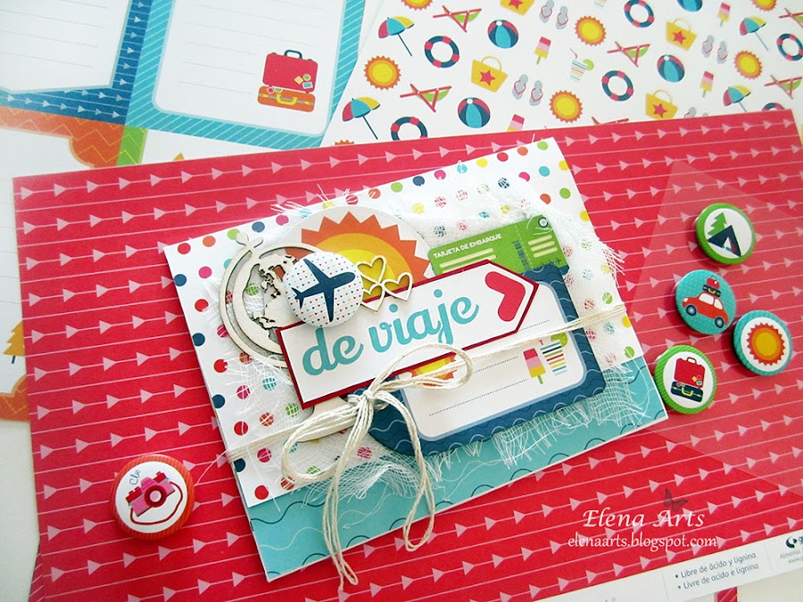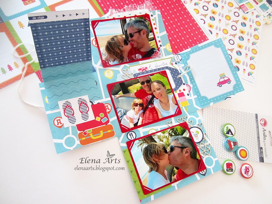 Para el álbum he escogido unos papeles preciosos de Anita y su mundo de la colección "De viaje". Es un kit de papeles con pegatinas y recortables, también hay unas chapas que son una monada y además unos sellos a juego. Me encantan estos colores vivos y alegres del estilo americano para hacer unos proyectos infantiles o algún álbum familiar. Me encanta utilizar en el trabajo todo lo que se necesita para crear y decorar, donde todos los materiales estén tan bien conjuntados. :)