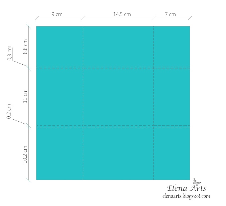 Con una plegadora de papel ( yo utilizo un bolígrafo que ya no escribe) marcamos las medidas que se muestran en el dibujo de abajo. Se puede escoger otras medidas dejando los lados más irregulares, pero tened en cuenta el tamaño del rectángulo que se forma en el centro porque de ese tamaño va a ser vuestro mini álbum una vez doblado el papel.