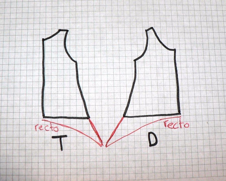 Y ya por último hice el corte asimétrico. El largo total en los laterales y el largo mínimo en el centro. Simplemente medí cuanto quería por los lados midiendo desde la axila y cuanto quería en el centro midiendo desde el escote. Luego tracé una curva desde el centro hacia los laterales. En el centro hay que dejar unos centímetros rectos igual que en los escotes para que quede bien en esa zona y no haga picos. En los laterales dejé el pico bien marcado porque esa era mi idea.