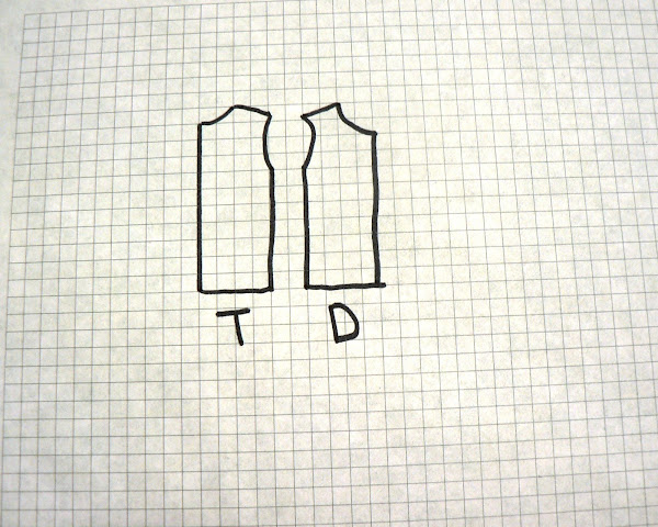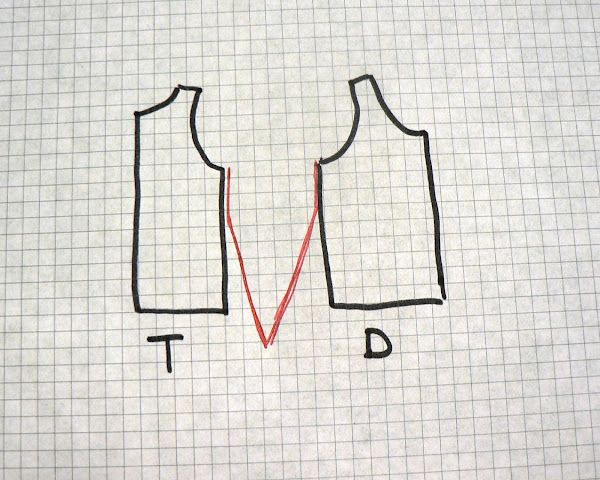 Disculpad las "ilustraciones" pero no saqué fotos al patrón con el que trabajé porque de verdad no esperaba hacer este tutorial y no sé dibujar en el ordenador. He hecho todos los dibujos a mano. Pero bueno, vamos a trabajar. Lo primero es hacer los tirantes. Si usas un patrón de tirantes puedes saltarte este paso. Si usas el patrón base o un patrón con mangas, has de marcar el punto central donde quieras los tirantes. Para hacer eso yo mido en mi hombro donde los quiero, por ejemplo, a seis centímetros del cuello, y marco a seis centímetros del cuello en el patrón. Luego marco cómo de ancho los quiero, por ejemplo de cuatro centímetros, y pongo dos centímetros a cada lado de la marca central. Cada una deberá marcar como le apetezca. También rebajo dos centímetros la sisa debajo de la axila y redondeo. Luego marco como quiero los escotes. Más pronunciado por delante y menos por detrás. Para medir el escote es un poco lo mismo pero midiendo desde los huesos de la clavícula hacia abajo. Y es muy importante dejar al menos un centímetro recto en los centros de los escotes o si no luego se verá un pico.