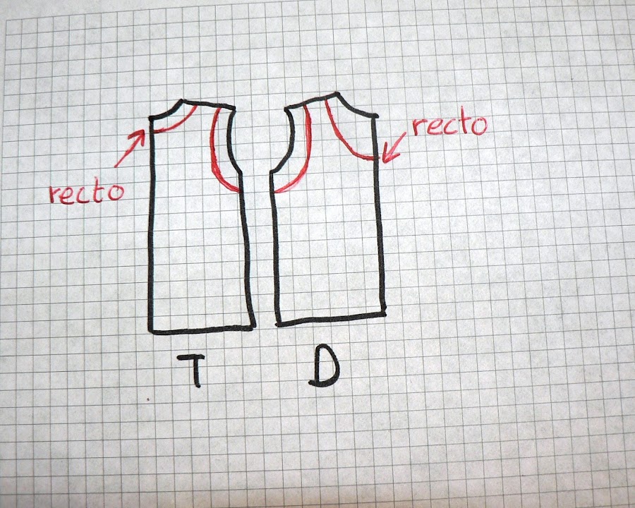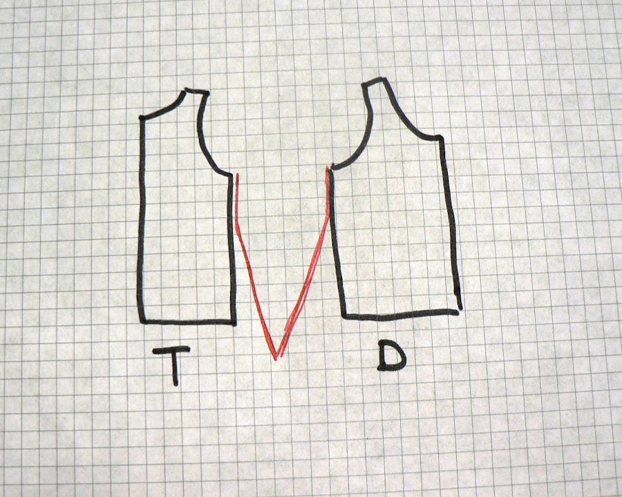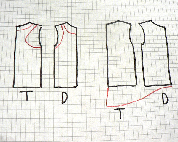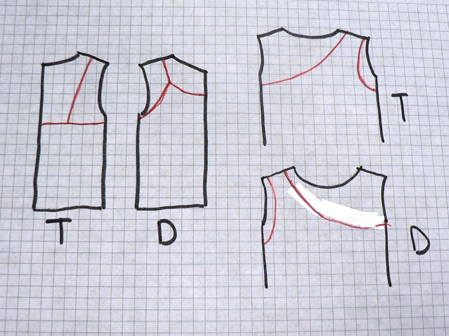 Y en la última foto podéis ver las transformaciones para una camiseta de tirantes finos a la izquierda y un sólo tirante asimétrico a la derecha. Tened en cuenta que si queréis hacer un patrón asimétrico tendréis que dibujar el patrón entero, no solo la mitad. Y tendéis que cortar con la tela estirada y no doblada como normalmente hacemos.