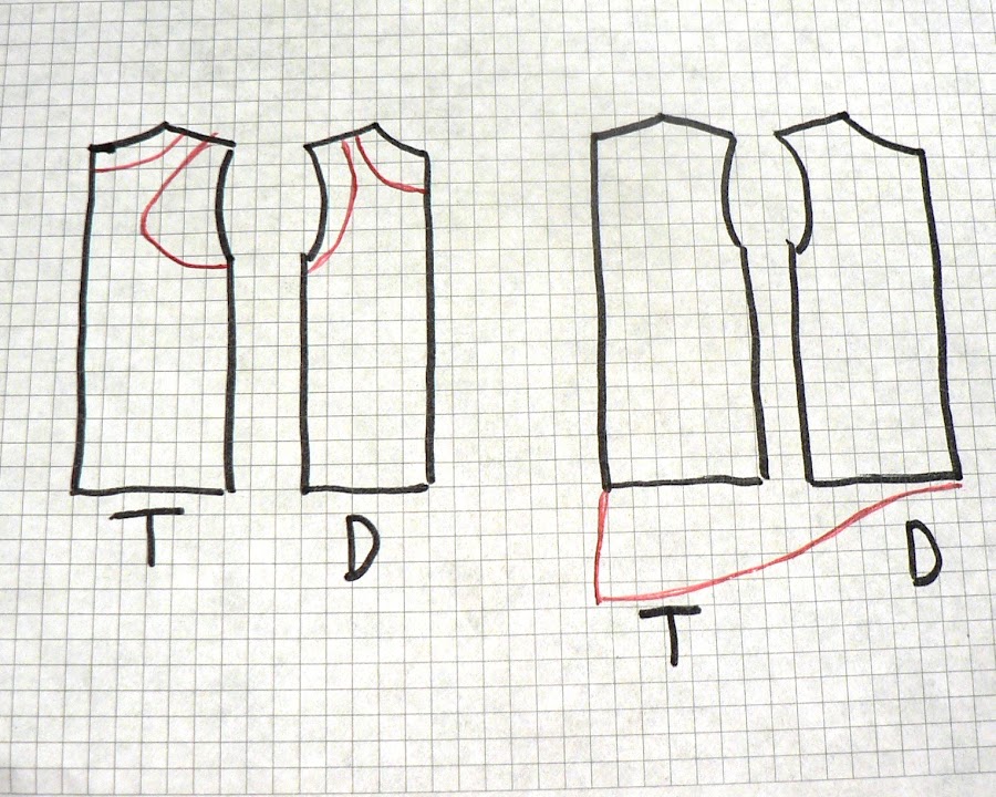 Y ya tenemos listo el patrón!!! Esta es la modificación que he hecho yo, pero hay muchas otras que podemos hacer. Todo depende del efecto que queramos conseguir. Por ejemplo en la imagen de debajo podéis ver la transformación para conseguir un escote de nadador a la izquierda y un bajo asimétrico corto por delante y largo por detrás a la derecha.