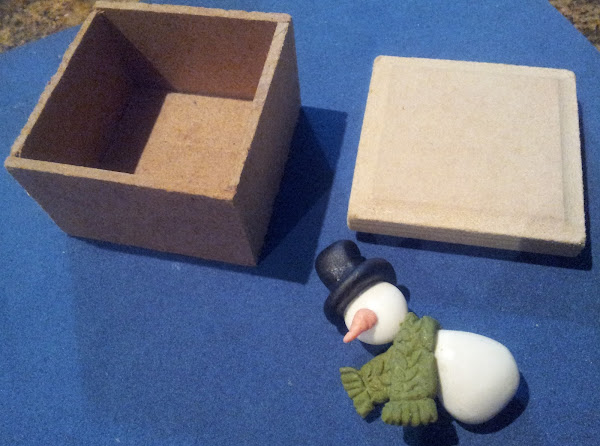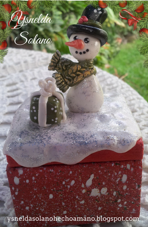 5.- El pequeño Muñeco de Nieve, decora un cofre rojo. Con porcelana fría blanca cubrimos la tapa simulando una capa de nieve que resbala por las orillas de la tapa.