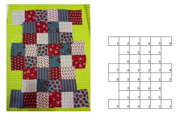 Lo primero que haremos será unir los cuadros tal y como indica el esquema. Emplearemos cuadros de 7x7cm, y 7 colores diferentes. Los colocaremos según el esquema para que luego no nos coincidan los colores en las costuras.
