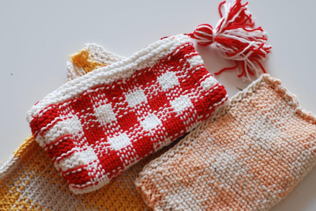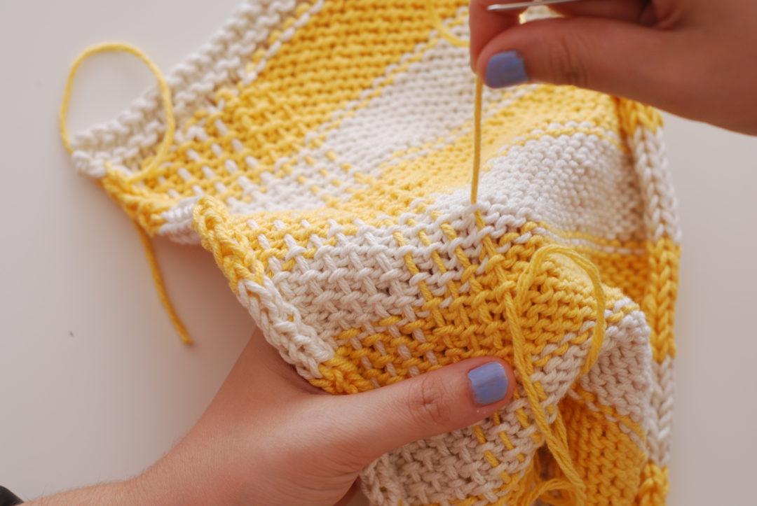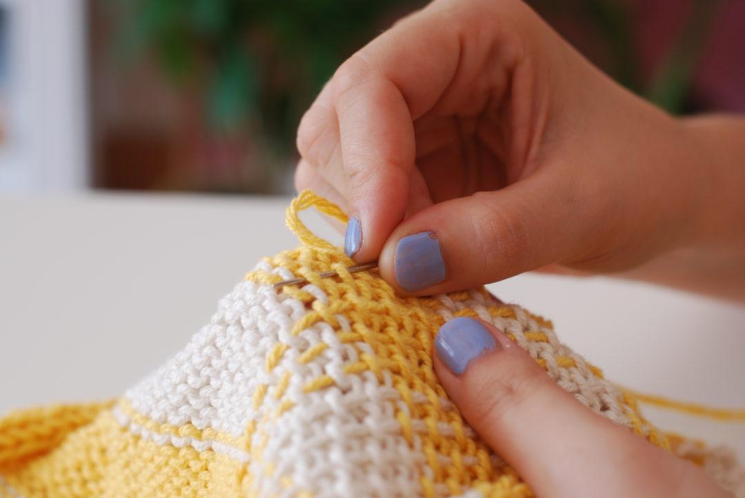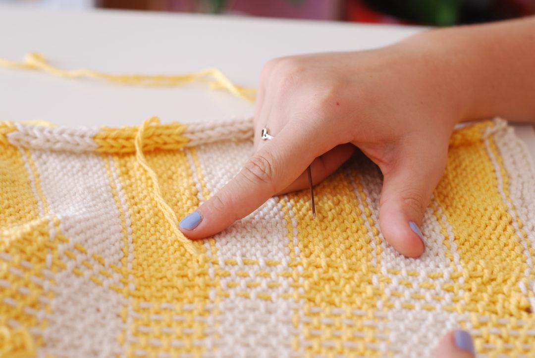 Con una aguja lanera, vas pasando el hilo por todas las filas, pasando el hilo un punto por arriba y otro por abajo, para así crear el efecto e ir cambiando el color del hilo cada 8 pasadas para ir formando los cuadraditos