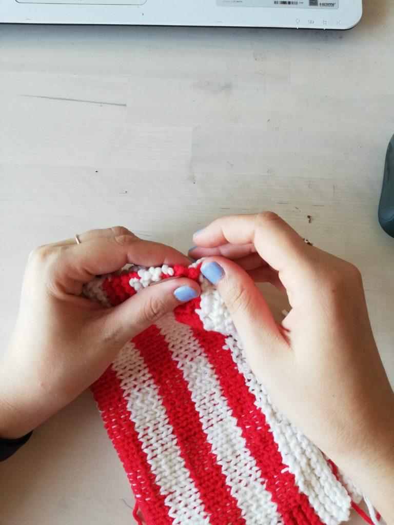 Cambiamos de color al rojo y tejemos 6 vueltas en punto jersey, teniendo en cuenta que los primeros y últimos 5 puntos se tejen siempre del derecho.