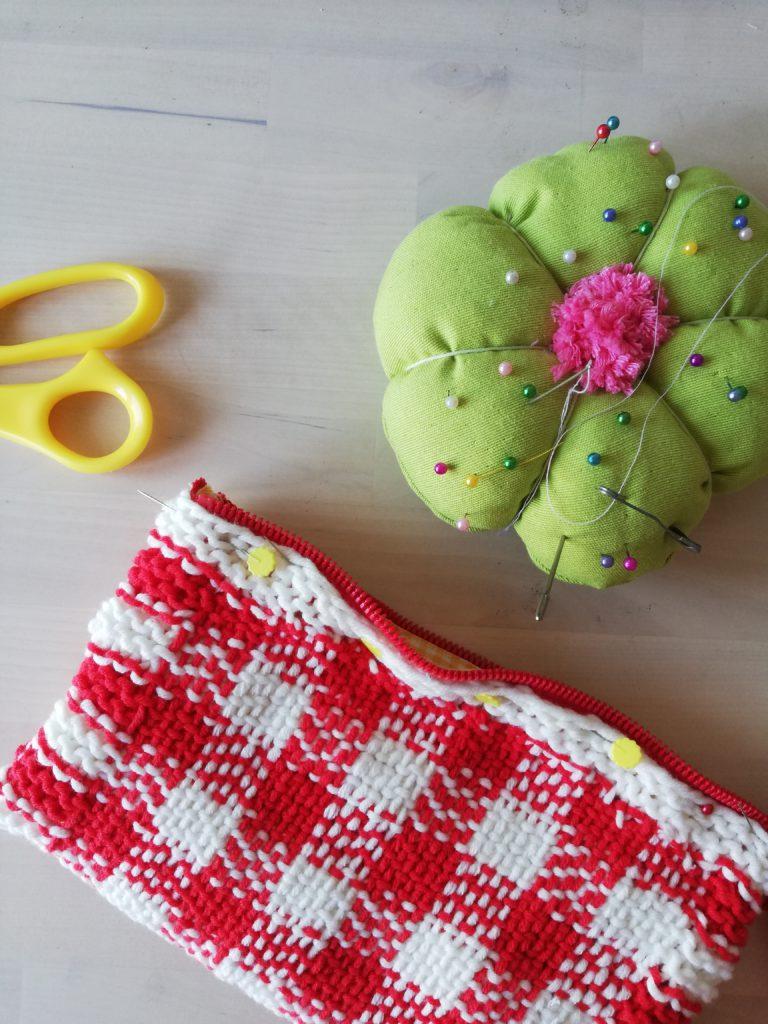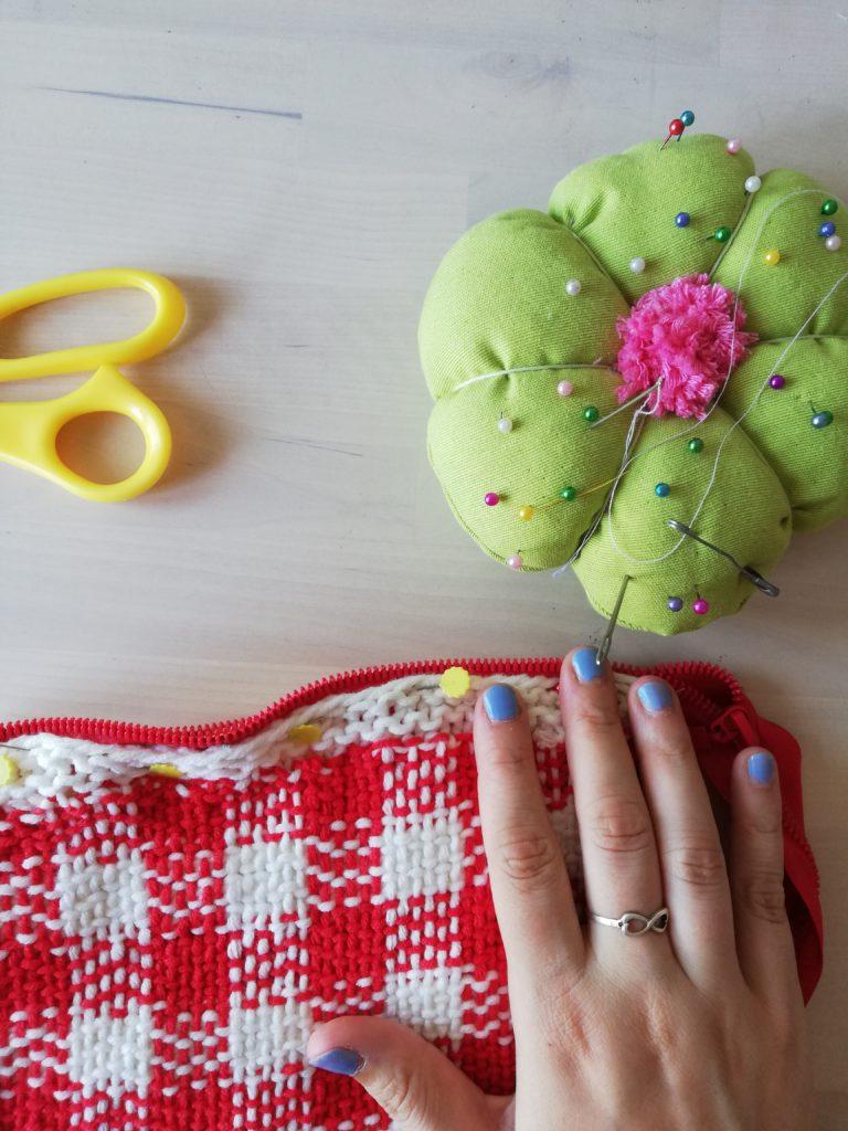 Por último, cortamos un trozo de tela un poco más pequeño que nuestro neceser, le cosemos la cremallera y lo ponemos dentro de nuestro neceser. Ponemos alfileres por todo el borde y cosemos a mano la cremallera.