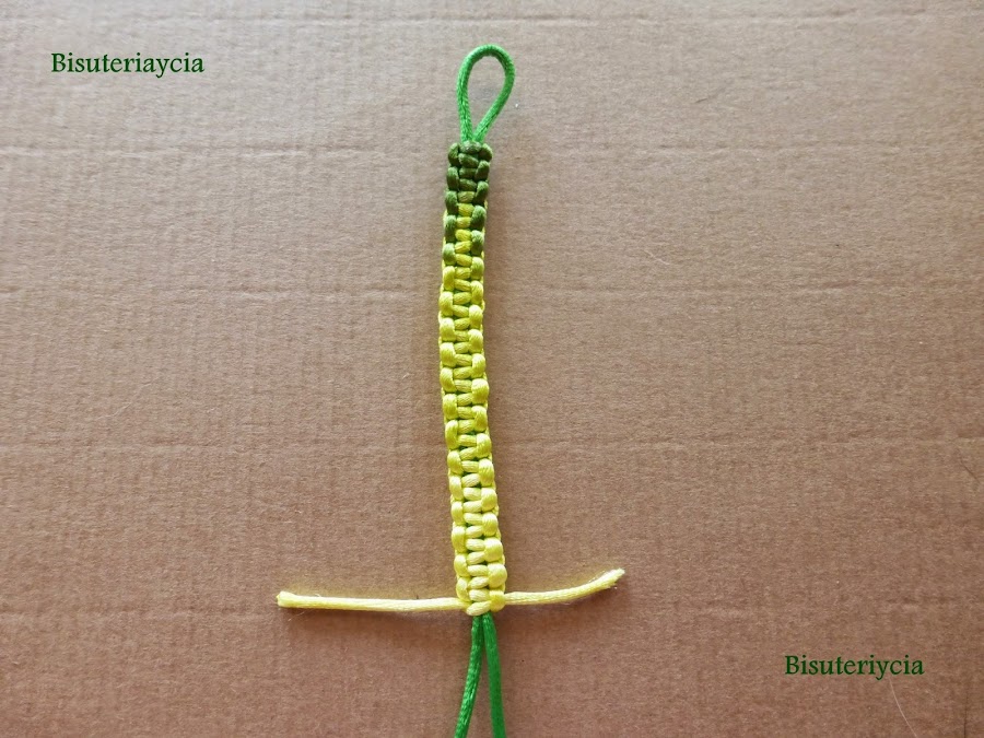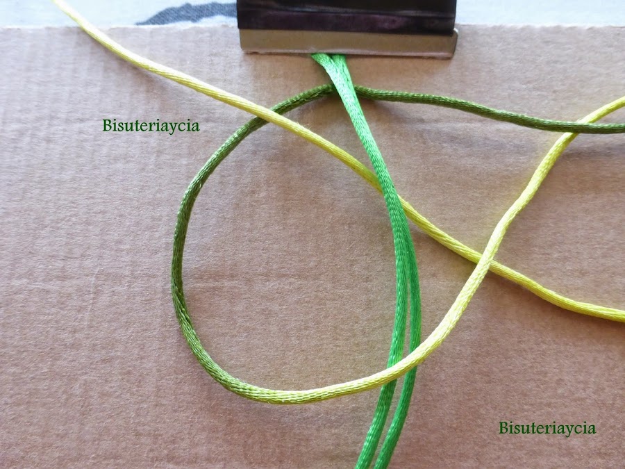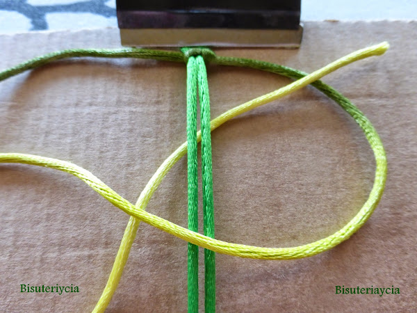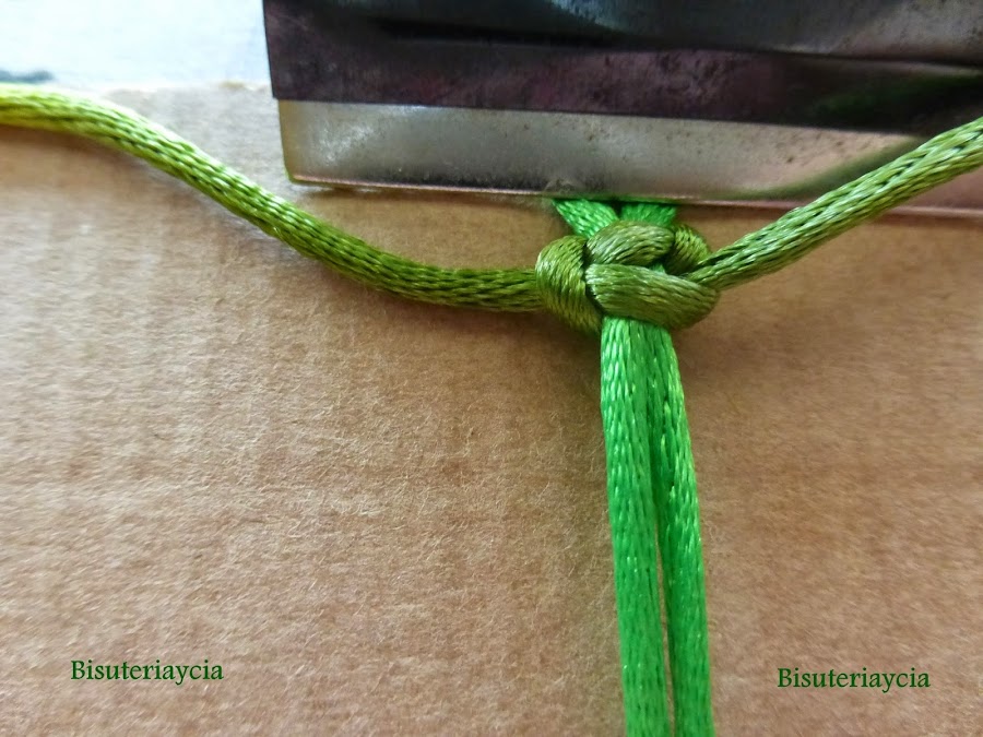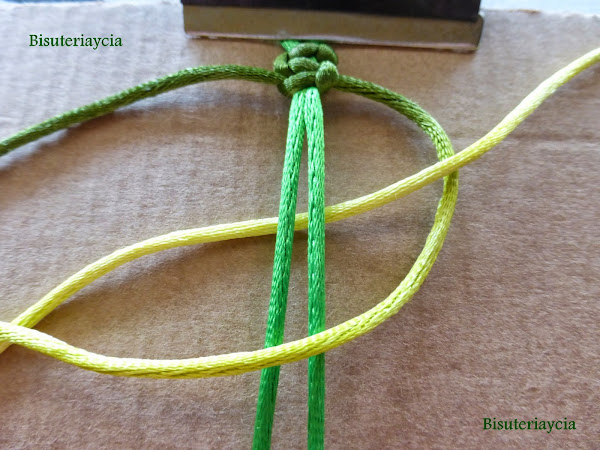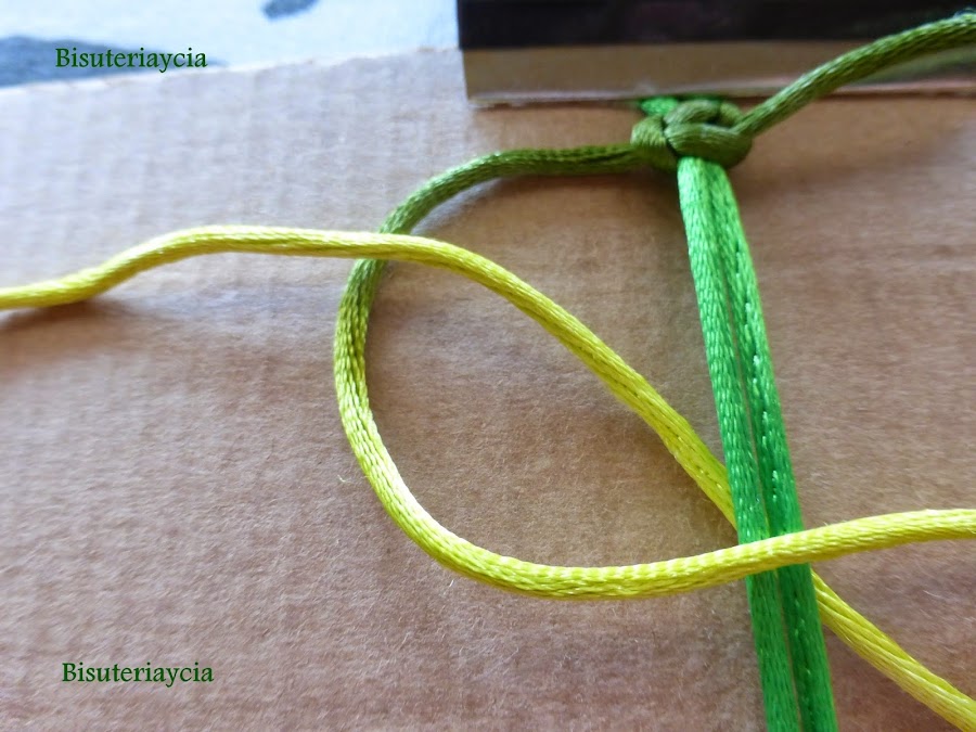 El extremo opuesto lo pasaremos por debajo de la corbatura del primero y de los hilos centrales y lo sacaremos por encima de la "orejita", y tiraremos de ambos extremos.