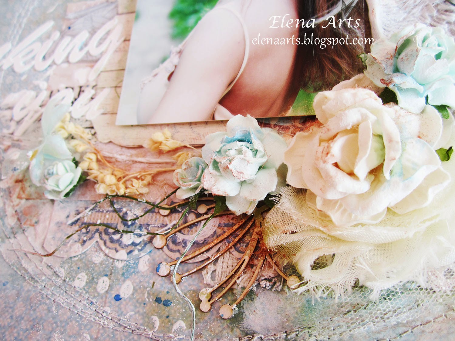 Also I put some flowers, a butterfly, a few chipboards, a wing from Prima marketing and the title. At the left top of the page, I created a small group of elements to balance the main composition.