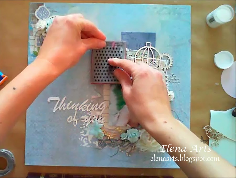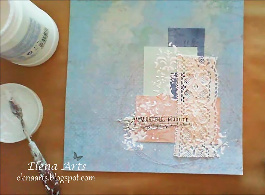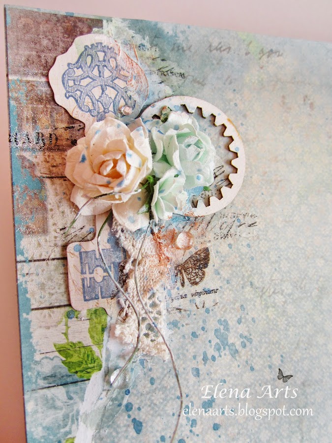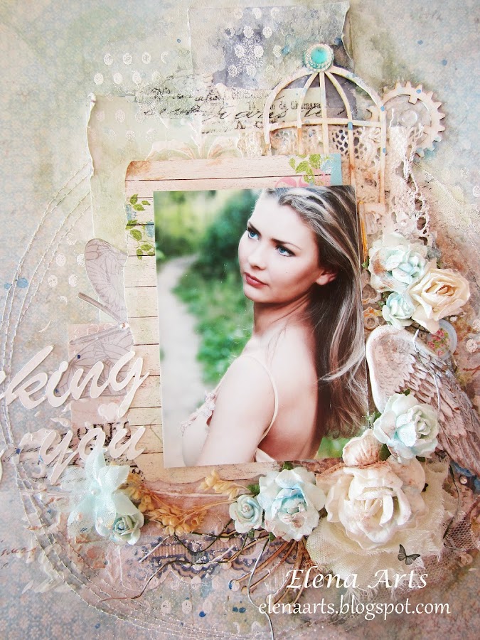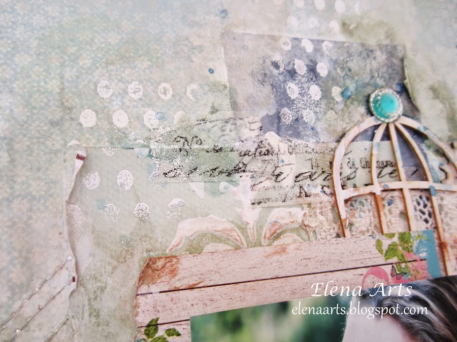 How did you begin this 2015? I have spent it very well, resting with family, having a few unforgettable days. I"ve disconnected from scrap and I sincerely didn´t do anythings. :)) I took my own holydays and I rested a lot. So I come back to take my scraperos treasures; paints and gesso, and with inspiration in the hand, I created this page of Shabby Chic. This photo is my dearest cousin Gala who lives in Moscow, she is a beauty girl and person too;)) pretty! muacks! To create this layout I chose soft colors in shades of blue and green, with a few touches of gold. I have created a TUTORIAL wich you can find below.