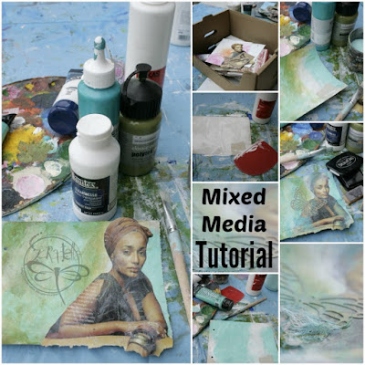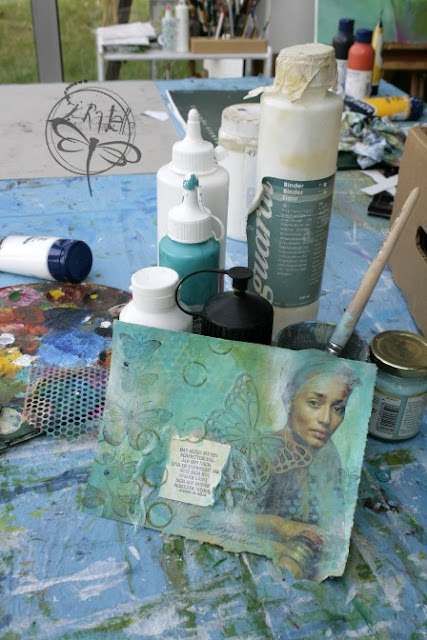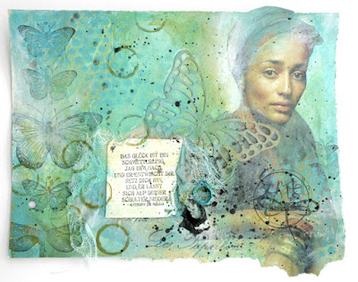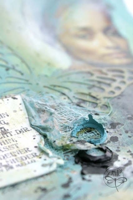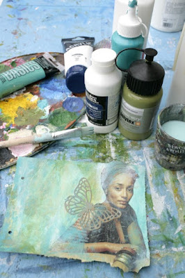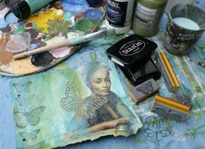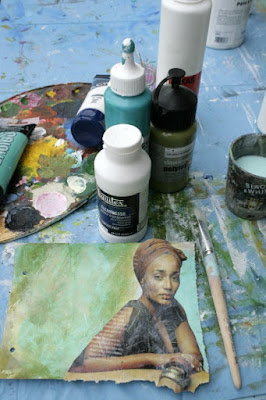 Como ya tengo una idea de lo que será mi página ya terminada no necesito exagerar dando y dando colores por doquier (disque para ver qué me sale) , así que procedo a pegar "el hombro" que necesito, un recorte de una revista, y le doy una capa de gesso transparente que me va a proteger la imagen para no taparla con color totalmente, porque me interesa que se vea. Repito: Se deja secar muy bien.