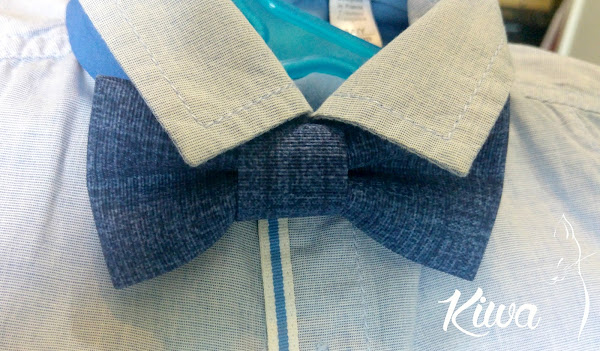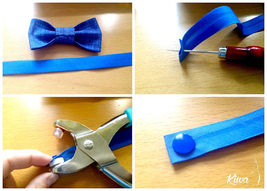 Solo falta la tira de biés para ajustar al cuello. La introducimos en la pajarita, doblamos un extremo y colocamos el snap macho. Para colocar el snap hembra recomiendo colocar la pajarita al niño para dar con la medida adecuada. Dobla el extremo del biés para que el snap no esté colocado en una sola capa de tela, además así el extremo queda limpio y no deshilachará.