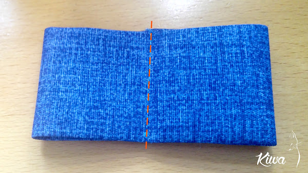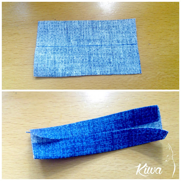 A continuación, tal y como hicimos con el retal grande, marca el centro del retal pequeño y dobla los lados largos, marcando la doblez con la plancha.