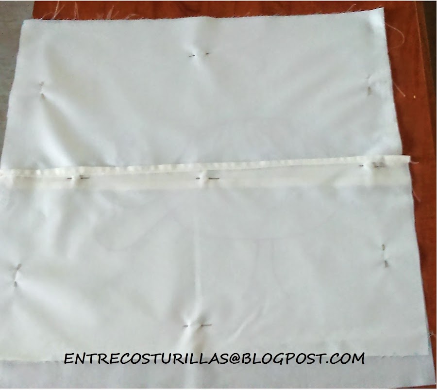 2.-Encaramos derecho parte delantera con derecho partes traseras, montando la parte superior sobre la parte inferior de las piezas traseras y lo cogemos con alfileres.
