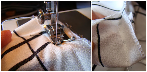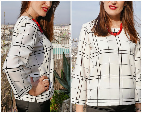Es un modelo muy sencillo, sin pinzas, costadillos, sin cuello, sin botones...y de hechura más bien amplia. Vamos, que no es el tipo de blusa de las que suelo llevar así que bueno, es un cambio de línea. Todavía no sé si le meteré la tijera, al menos en las mangas. Pero por el momento esta es mi nueva blusa. Hecha con una tela un poco rígida que ha sido buena a la hora de coser y con unos cuadros que si tuvieran algo de color serían como un cuadro de Mondrian. Esta blusa es mi apuesta para el Rums de hoy.