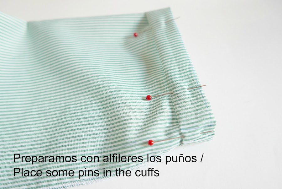 Prepararemos los bajos de las mangas con alfileres ( no olvidéis medir el largo de manga del niño)