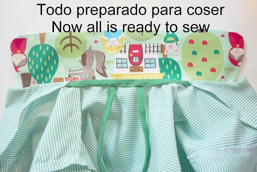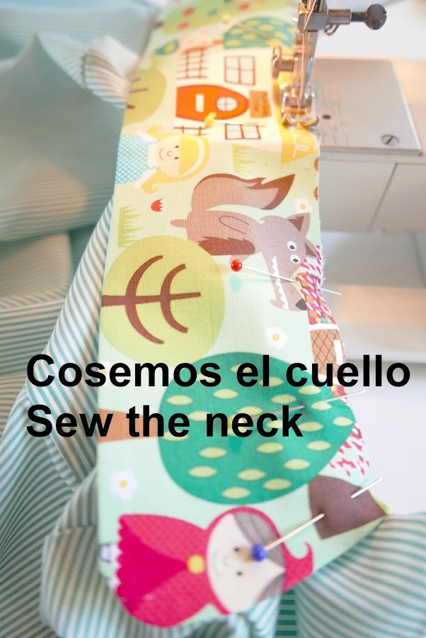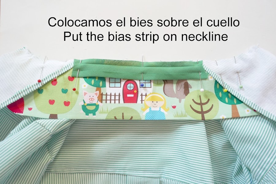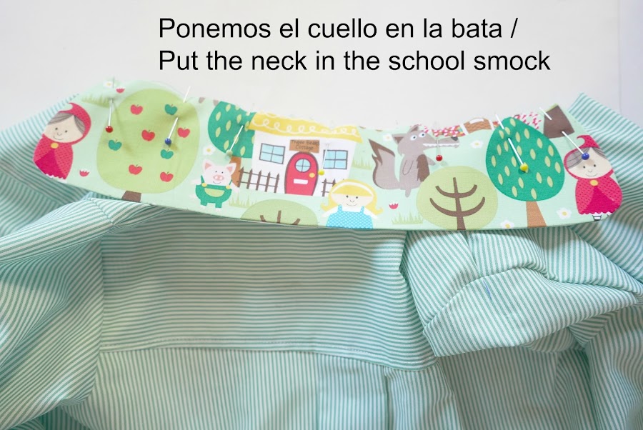 Colocamos la tira para colgar (en los colegios suelen pedir que sea de 18 cm) y la colocamos entre el cuello y el bies que cubrirá el cuello