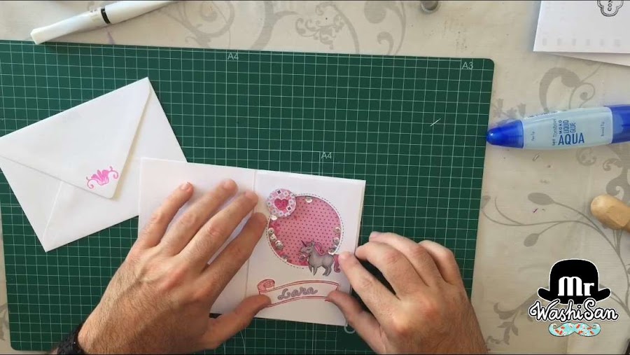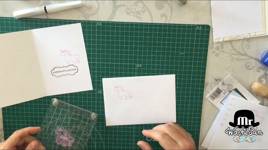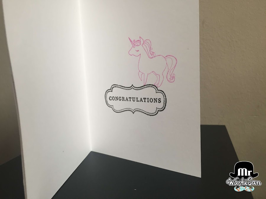 Antes de pegar el frontal a nuestra base de tarjeta estamparemos el interior con el motivo del unicornio y una frase de felicitación.