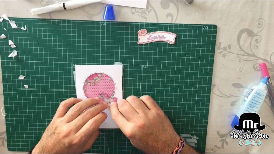 Pegamos un unicornio de manera que la cabeza quede sobre plástico transparente, pegamos también el pergamino con el nombre y podemos acabar de completar lo que algunos decoraciones (unos círculos de papel decorado y un corazón de cristal).