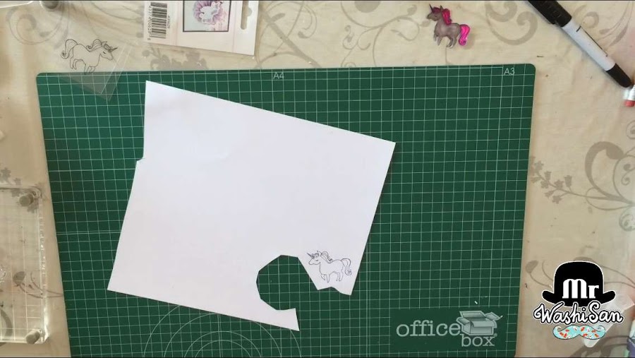 Estampamos nuestro motivo sobre una cartulina especial (para colorear con rotuladores de base alcohol), con tinta resistente al alcohol (memento) y coloreamos el unicornio con rotuladores de base alcohólica como los Copic o Twin Makers de Tiger.