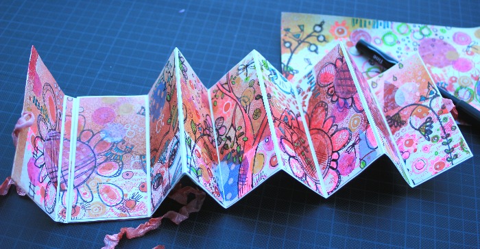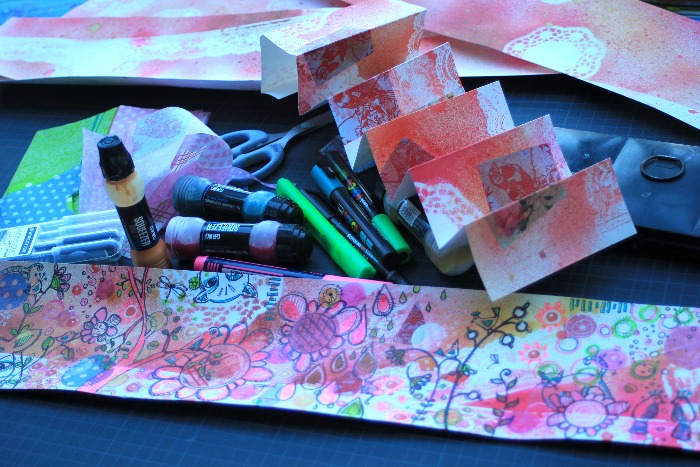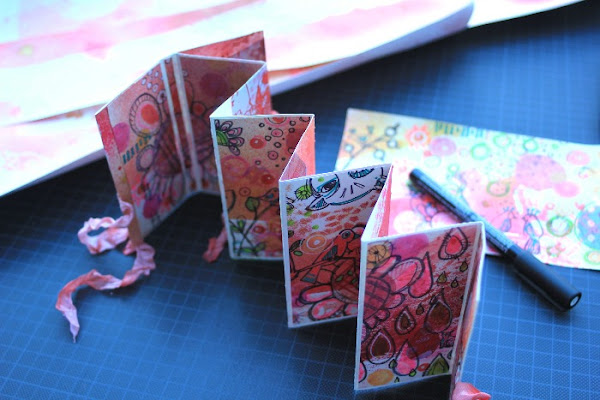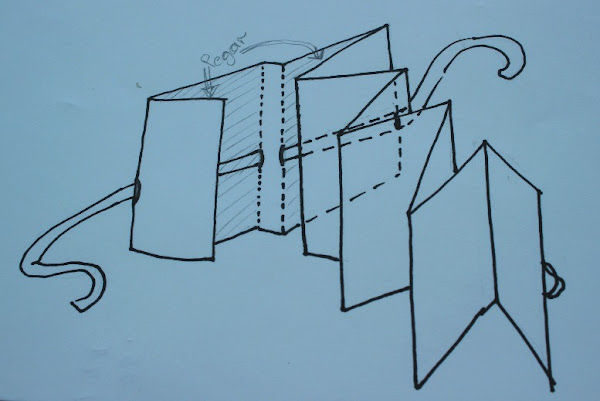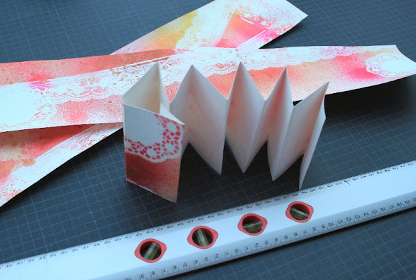 No te voy a dar medidas exactas porque todo depende del tamaño de tu papel y del formato que desees. En la entrada anterior (aquí) te mostré como entintaba el papel, pues ahora ya lo estoy usando. Con una sola tira de papel hago mi Leporello, pero sólo entinté un lado... hmmm, no quiero tener el otro lado blanco! pues uso otra tira, y a garabatear!