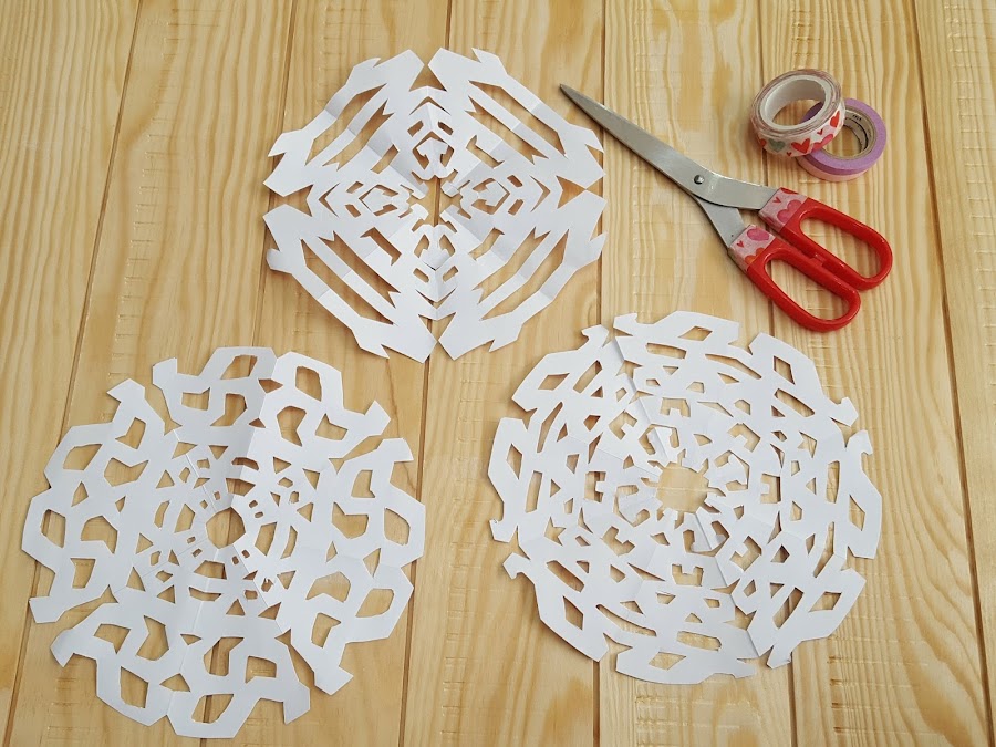 Y en cuanto hayas cortado cada palabra, abre cada uno de los dobleces y extiende el copo de nieve con mucho cuidado (8).