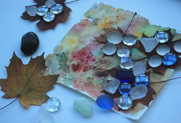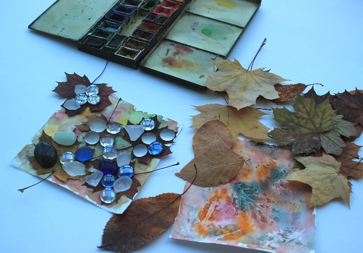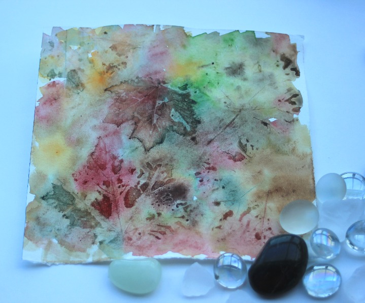 Acuarelas, agua, papel de acuarela ( grueso tipo cartulina, de unos 180 gr.) hojas secas y algo para hacer peso (en mi caso he usado piedritas), por supuesto también pinceles.