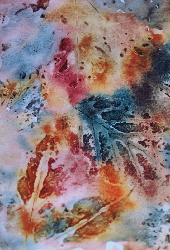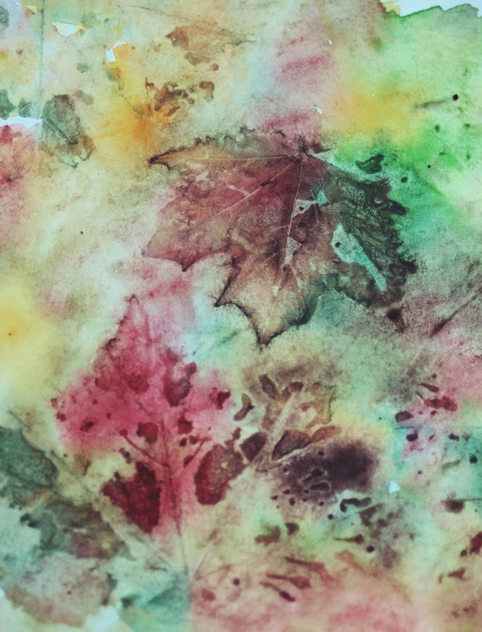 Colocamos los tonos que queramos en el papel, que haya bastante pigmento y humedad, luego disponemos las hojas como deseemos y encima de ellas ponemos peso, para lograr que se "impriman" bien en el papel. Dejamos secar muy bien antes de moverlas. (yo las dejo toda la noche)