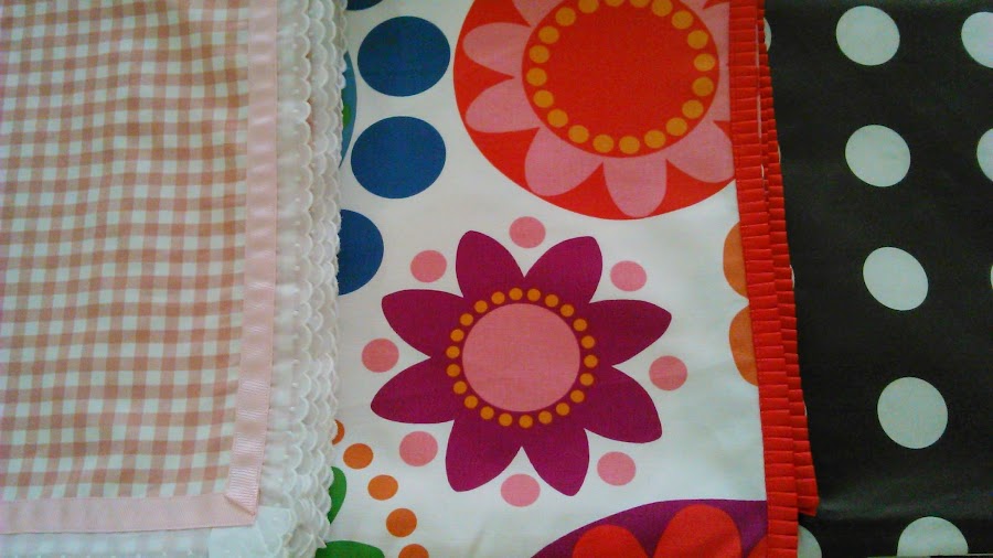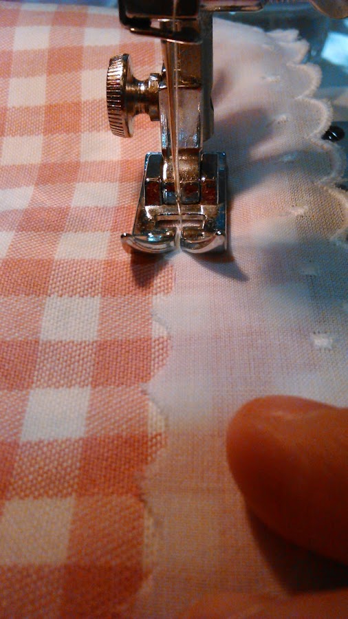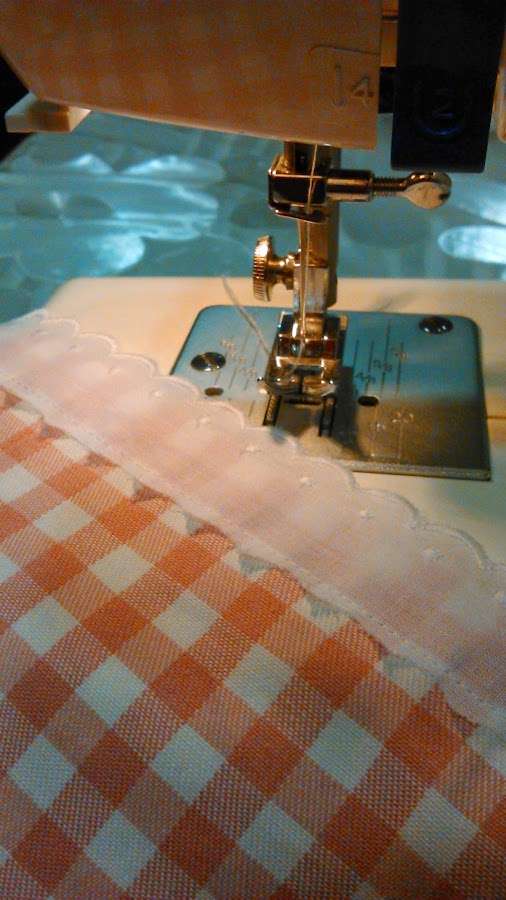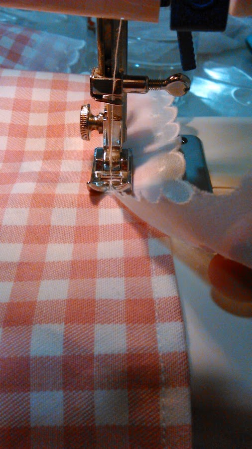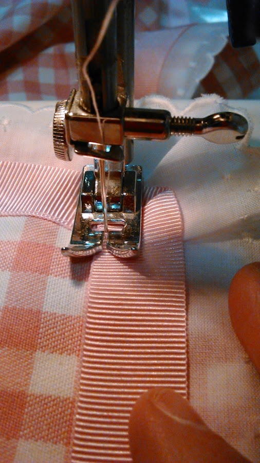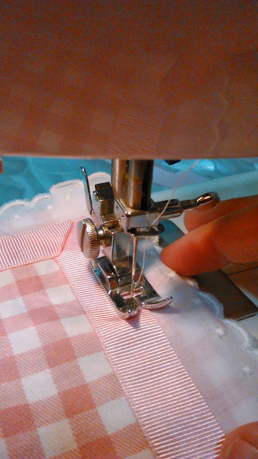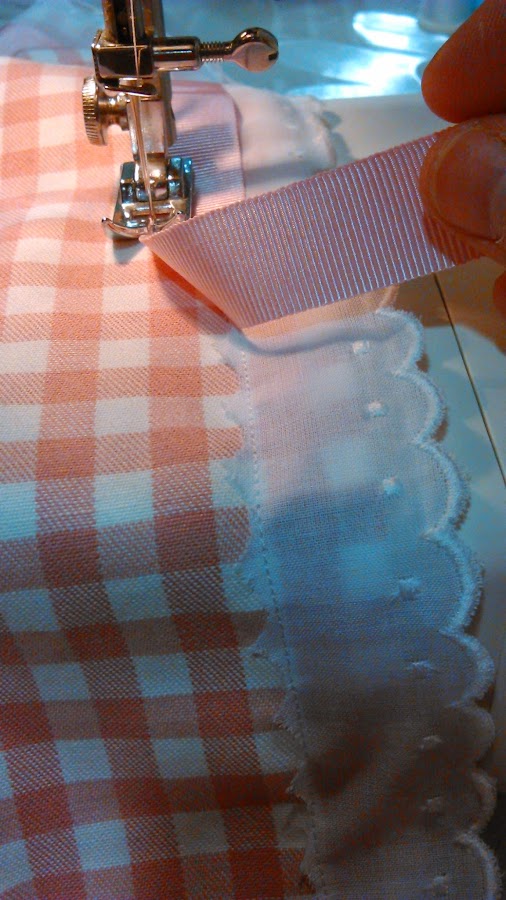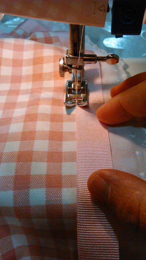 Los pasos a seguir son los mismos que los del segundo mantel. Lo único es que en lugar de coser en el borde la cinta plisada vamos a poner una cinta lisa de color rosa con una tira bordada.