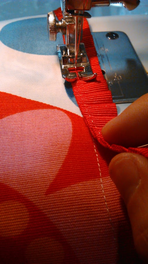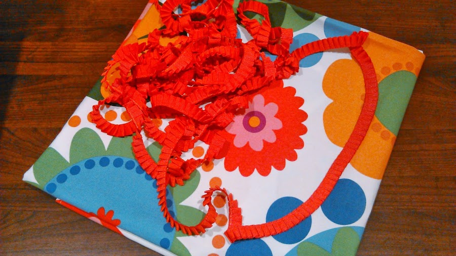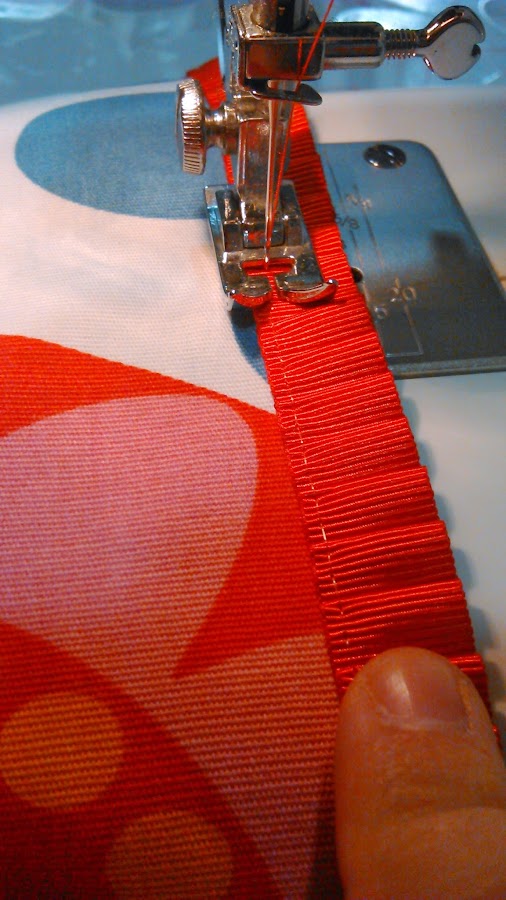 Paso 4 - como adorno coser en el borde del mantel, y con un simple pespunte, una cinta plisada de color rojo que podéis encontrar en cualquier merecería. La coseremos superpuesta al pespunte del dobladillo (Paso 3), que de este modo quedará cubierto y disimulado por la cinta, tal y como podéis ver en las fotos.