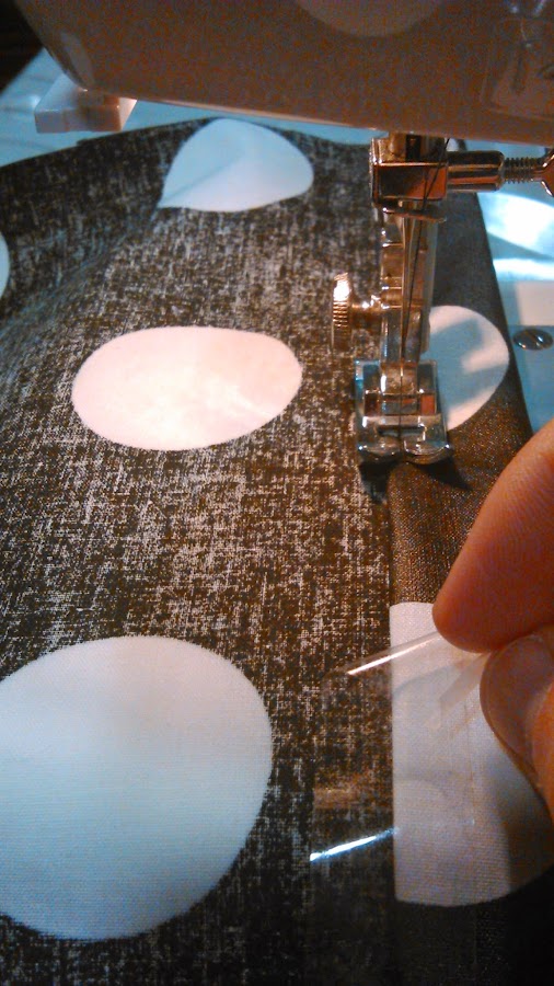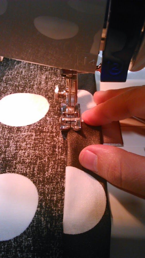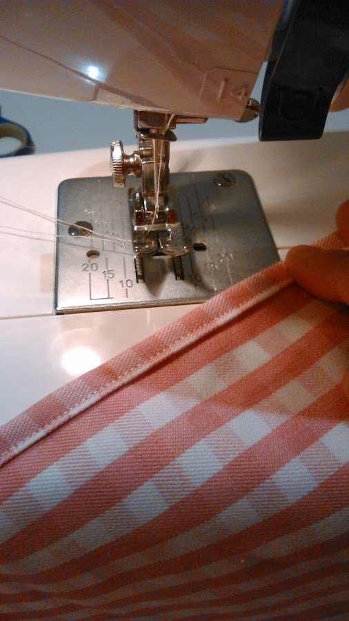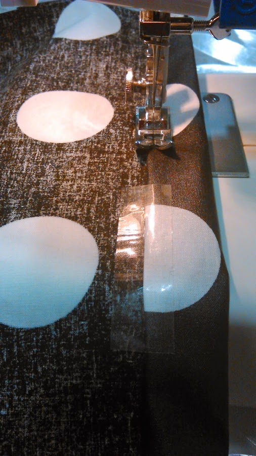 TRUCO: Como se trata de una tela plastificada no debemos utilizar alfileres para sujetar el dobladillo, así como tampoco se puede hilvanar porque quedarían en la tela las pequeñas marquitas o agujeritos de los alfileres o de la aguja. Recomiendo fijarlo con cinta adhesiva que retiraremos a la vez que cosamos el lateral. No sé si esto será muy profesional, pero funciona de maravilla. También os aconsejo estar muy seguras de cómo lo vais a coser porque si os equivocais y descoséis os quedarán las marcas del pespunte.