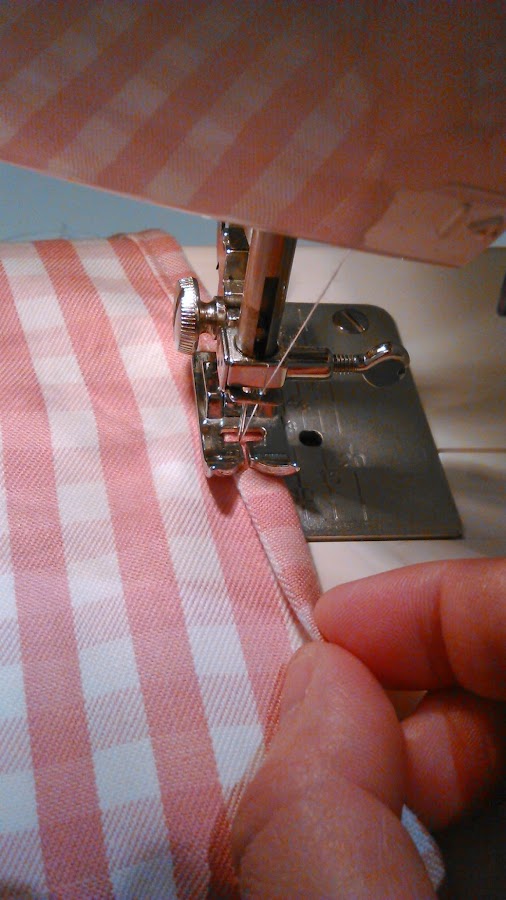 Paso 3 - coser a máquina el dobladillo, retirando poco a poco la cinta adhesiva antes de pasar el pespunte.