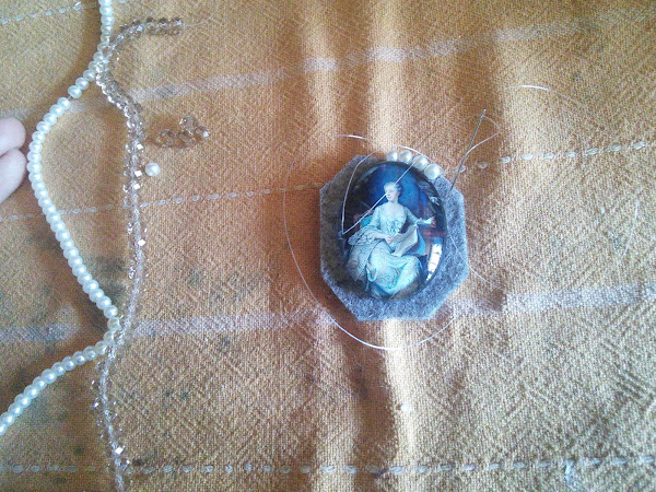 Pegamos el carbujón con nuestra hermosa dama al fieltro y, tras esperar a que se fije bien, empezaremos a coser con cuidado las perlitas de 4 mm. alrededor del carbujón.