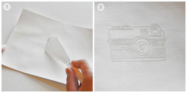 Cogemos la cartulina blanca pequeña y con una espátula cubriremos totalmente de gesso. Una vez terminado esperamos a que se seque o secamos con la pistola de calor.