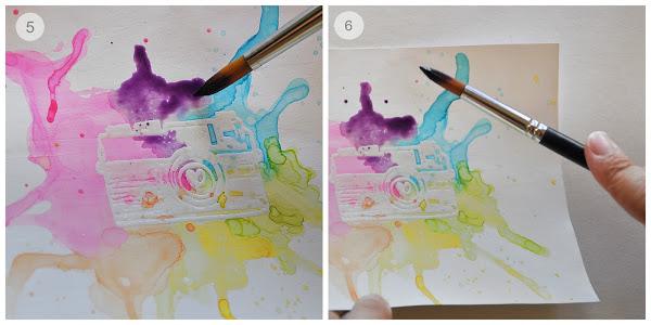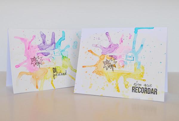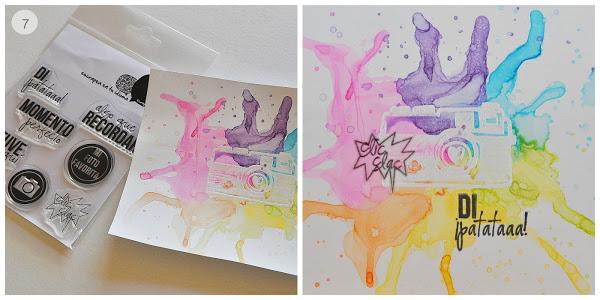 El paso anterior lo vamos a hacer con cada uno de los colores, y cada vez que terminemos con un color vamos a darle unos golpecitos al pincel para salpicar un poco con la tinta en la tarjeta.