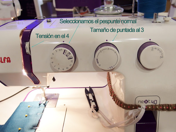 5.- En la máquina de coser, ponemos el largo de puntada en el 3, y usamos una aguja para coser jersey de punta bola.Seleccionamos el pespunte normal, y ponemos la tensión en el 4.