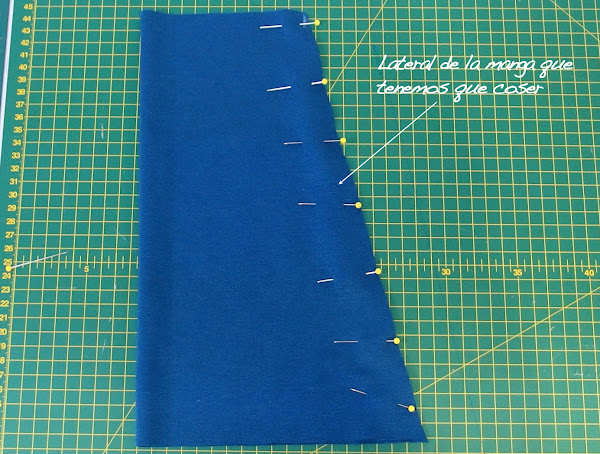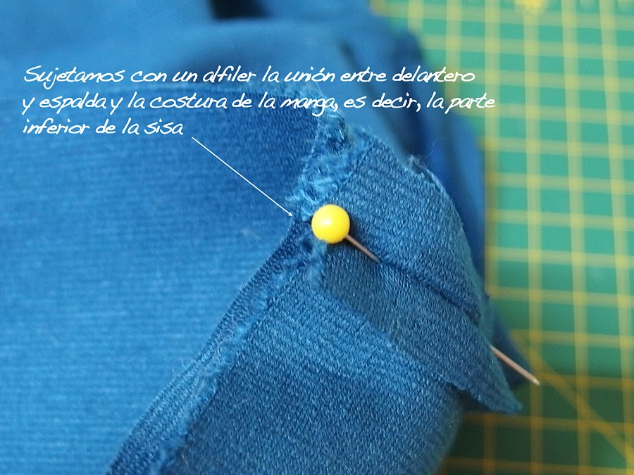 8.-Lo primero que tenemos que hacer es sujetar con un alfiler la unión entre el delantero, la espalda y la costura de manga, es decir, sujetamos la costura de la arte inferior de la sisa para asegurarnos que que las costuras nos van a coincidir perfectamente cuando cosamos la manga.