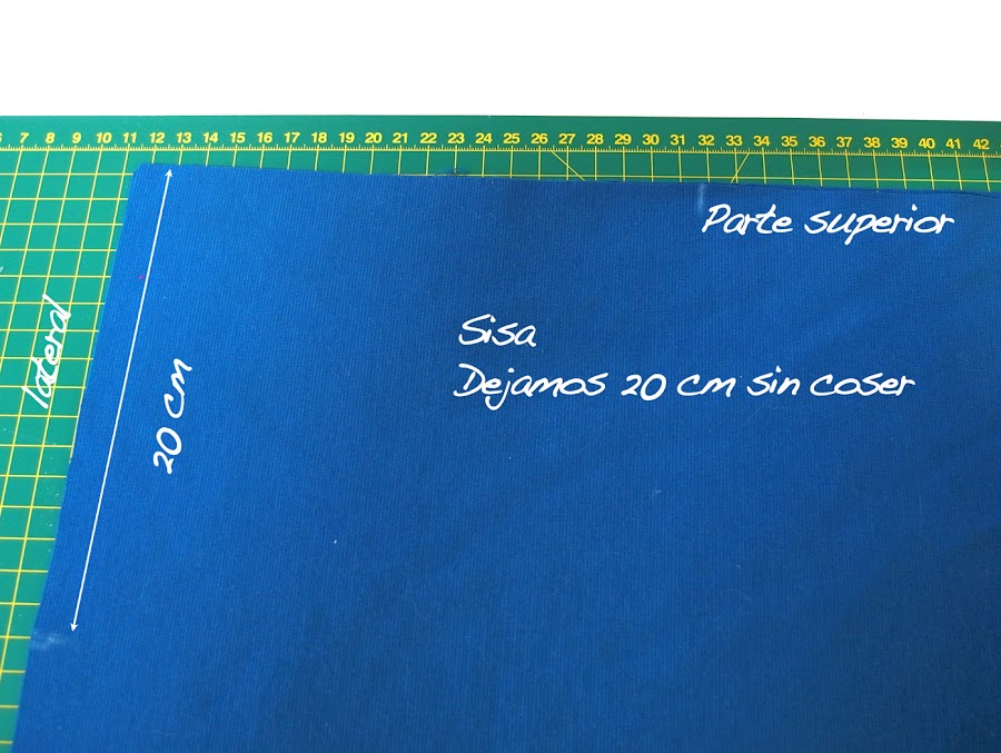 4.- Ahora tenemos que marcar las sisas. Para éllo, desde la parte superior de la camiseta, medimos la mitad de nuestra ancho de manga (descontando las costuras). es decir, nuestra manga tiene de ancho en la parte superior 40 cm (no cuento los 2 cm de costura), por tanto tengo que medir la mitad, 20 cm, desde la parte superior de la camiseta, para formar la sisa. Este el trozo que vamos a dejar sin coser.