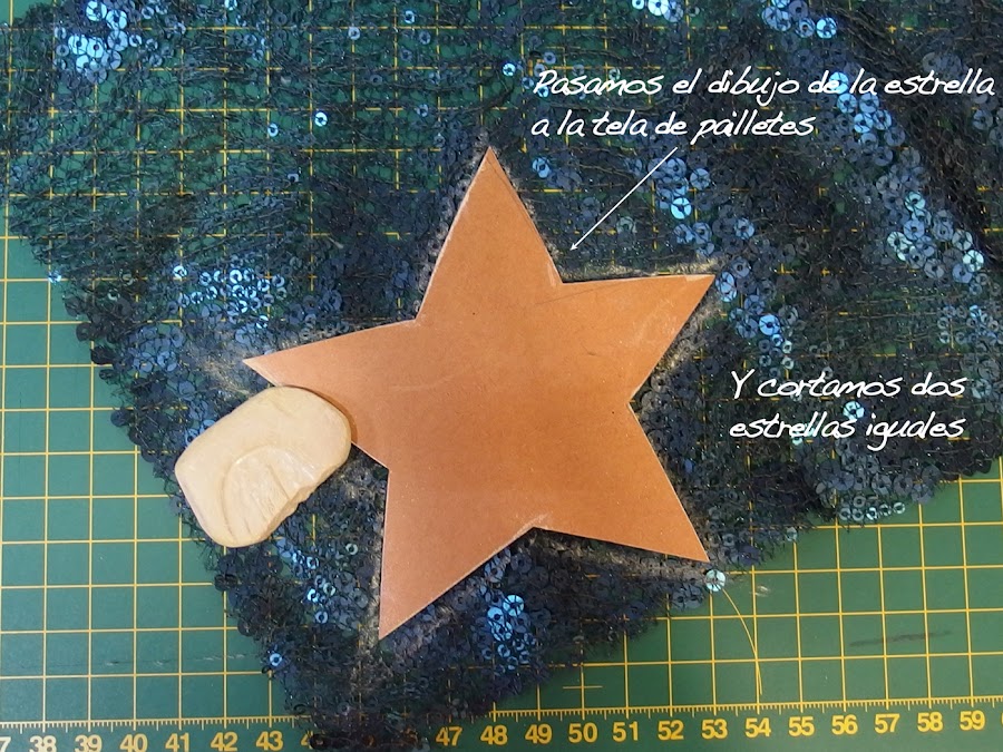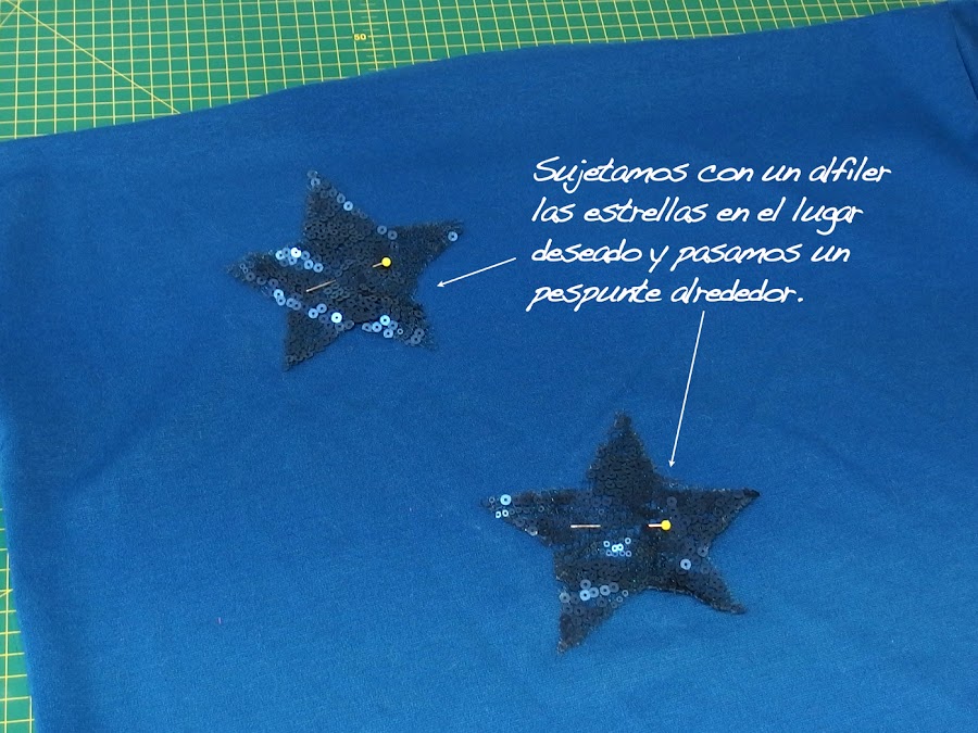 10.- La camiseta ya la tenemos terminada. El punto roma no hace falta rematarlo, así es que no es necesario hacer ningún dobladillo, pero es opcional. Si queréis coger el bajo o hacerle un dobladillo en las mangas, no hay ningún problema. Para decorar la camiseta, yo he puesto dos estrellas con tela de lentejuelas (pailletes). Para éllo, dibujamos las estrellas en la tela, las agarramos con alfileres a la camiseta en el lugar que más nos guste, y pasamos un pespunte alrededor.