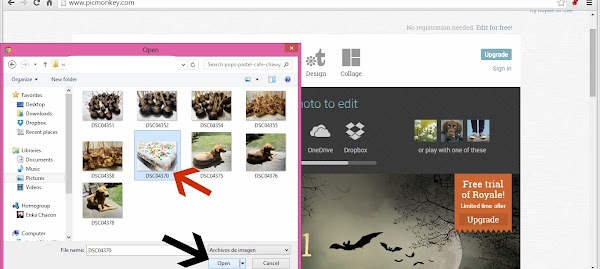 4. Al pinchar el botón EDIT , te lleva a la carpeta de donde sacaras la foto a editar , como ves escogí la de un pastel pinchando sobre ella , luego el botón OPEN .